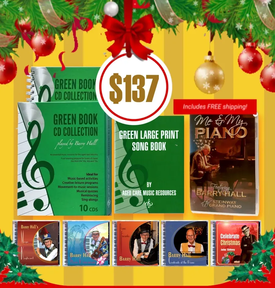 Journey through the Boomer decades with the Green Large Print Song Book and the Green Book CD Collection, featuring over 200 beloved hits from the 50s, 60s, and 70s — a treasure trove of timeless melodies to sing and reminisce with.